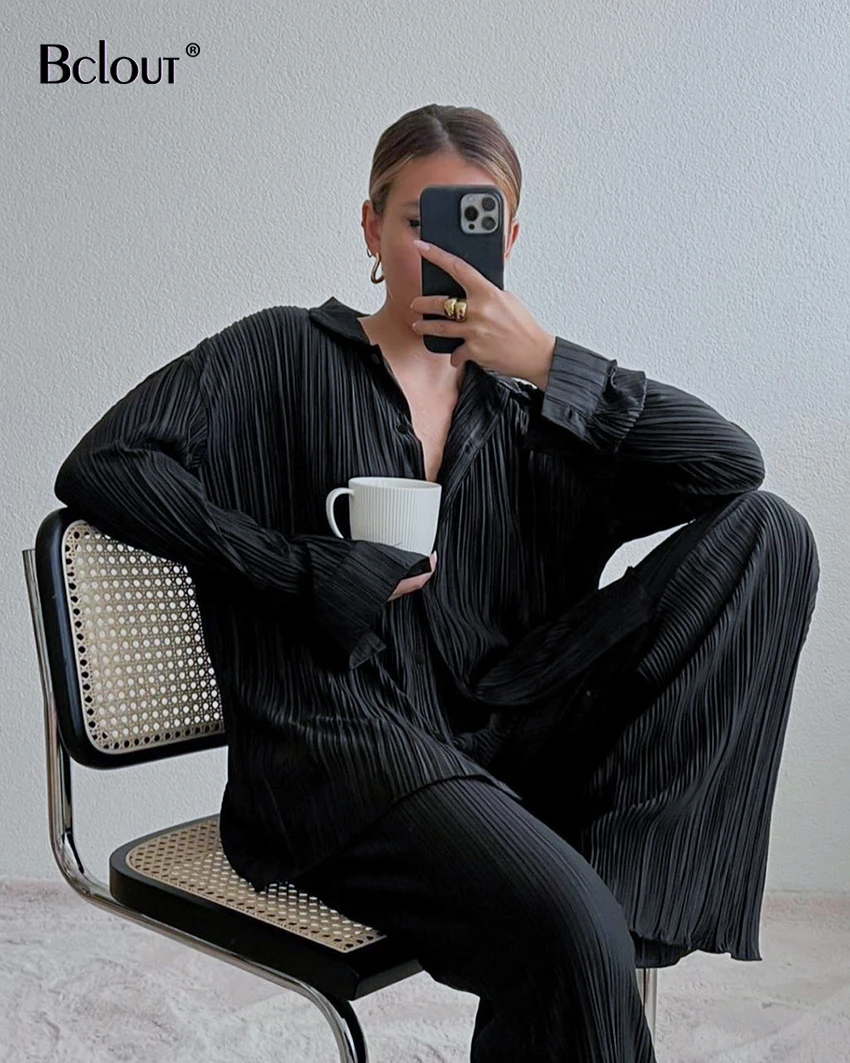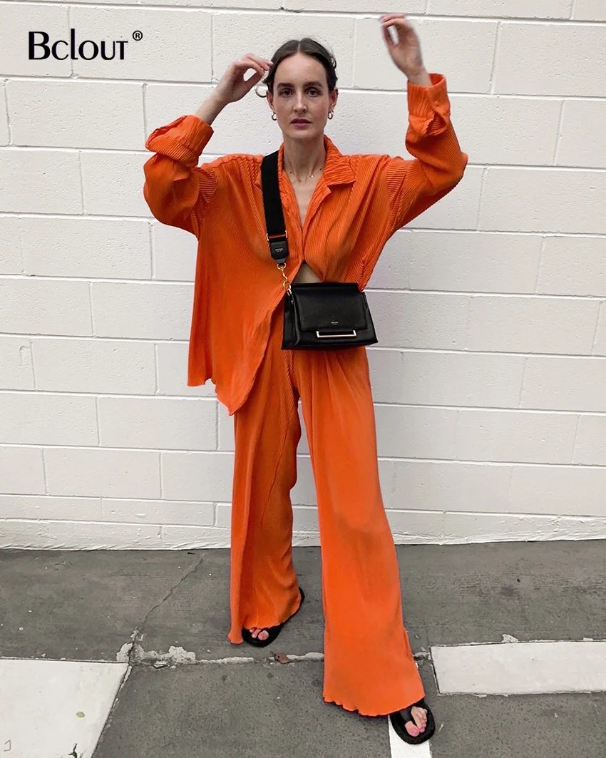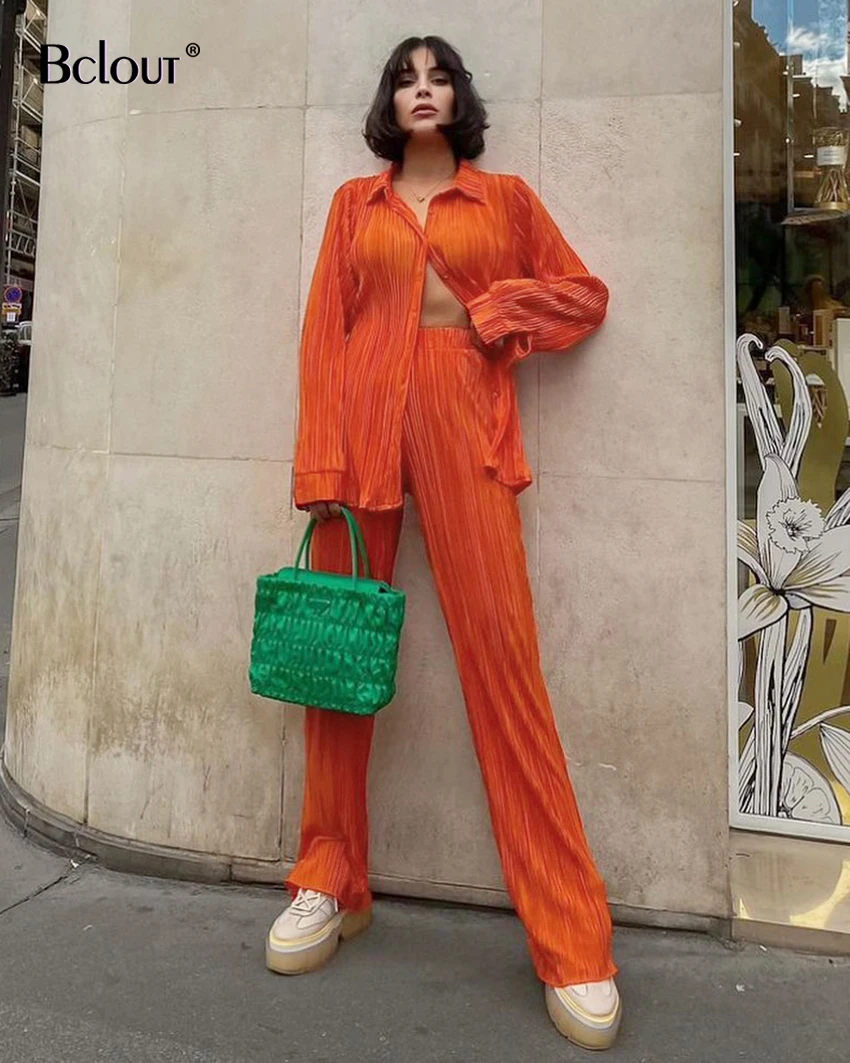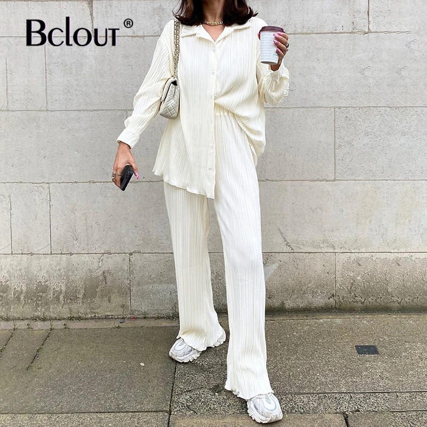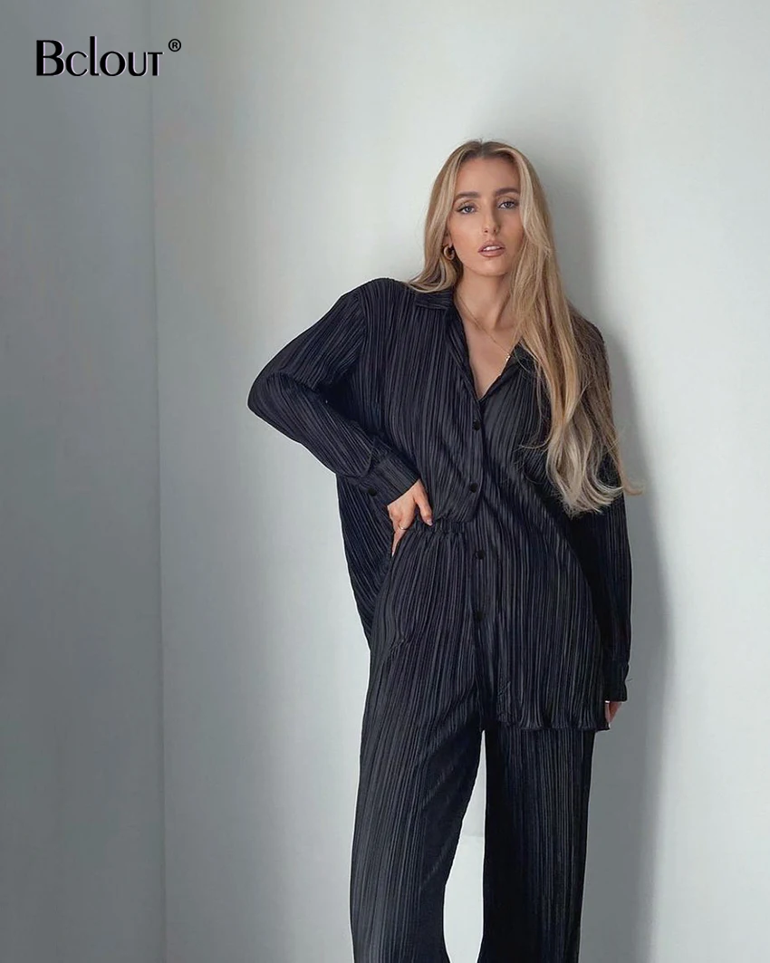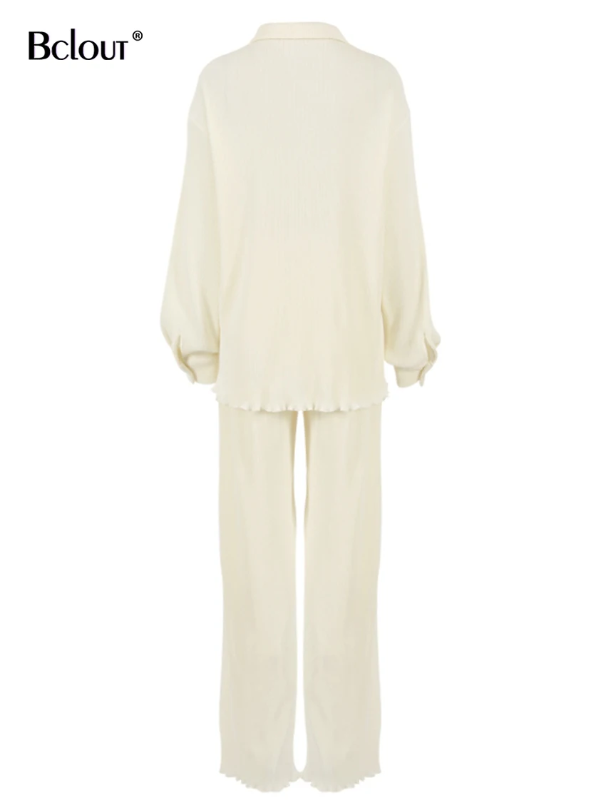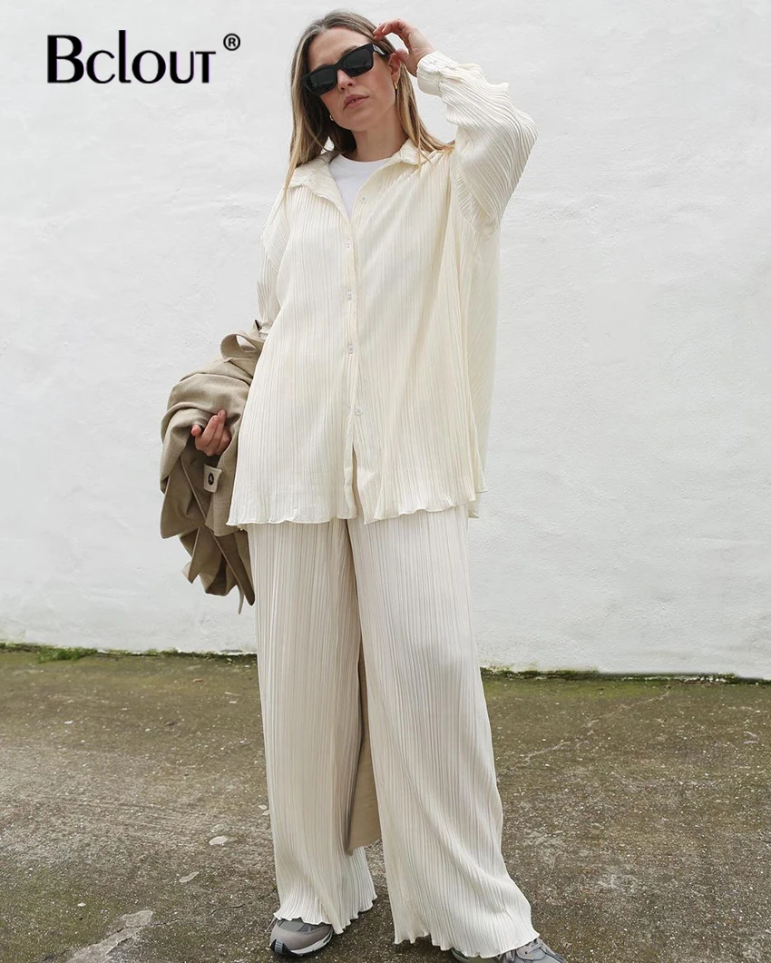 طقم بنطال أنيق بكلاوت وبيج مطوي للنساء ، ملابس من قطعتين ، بلوزات فضفاضة بأكمام طويلة ، بنطال طويل عالي الخصر ، بدلات خريفية ،