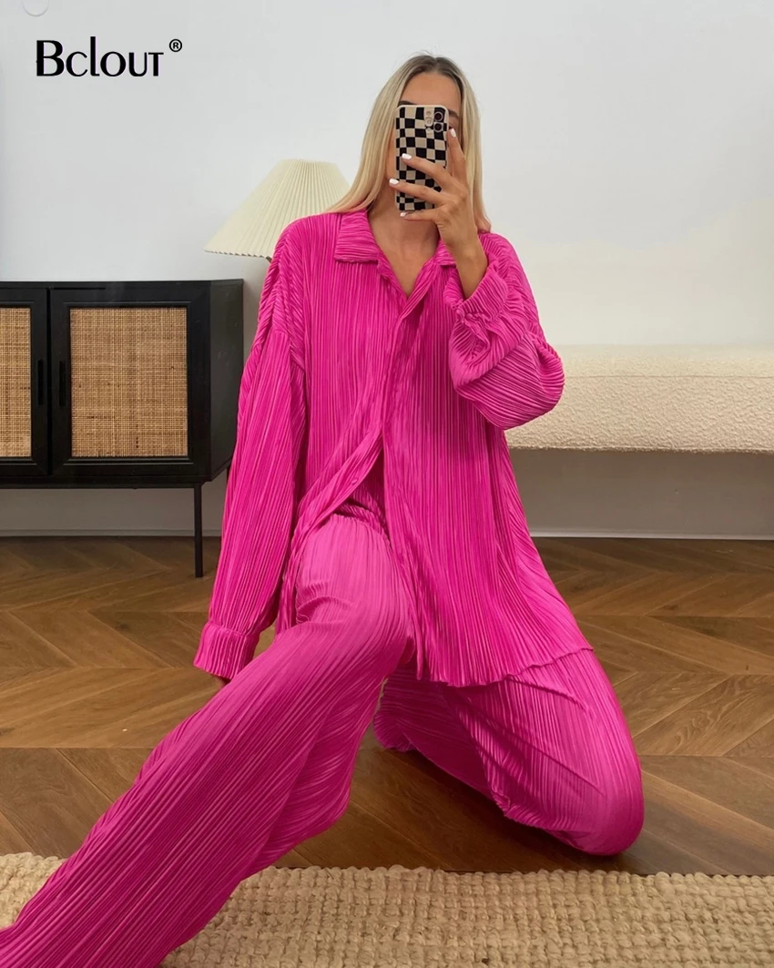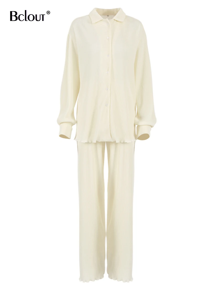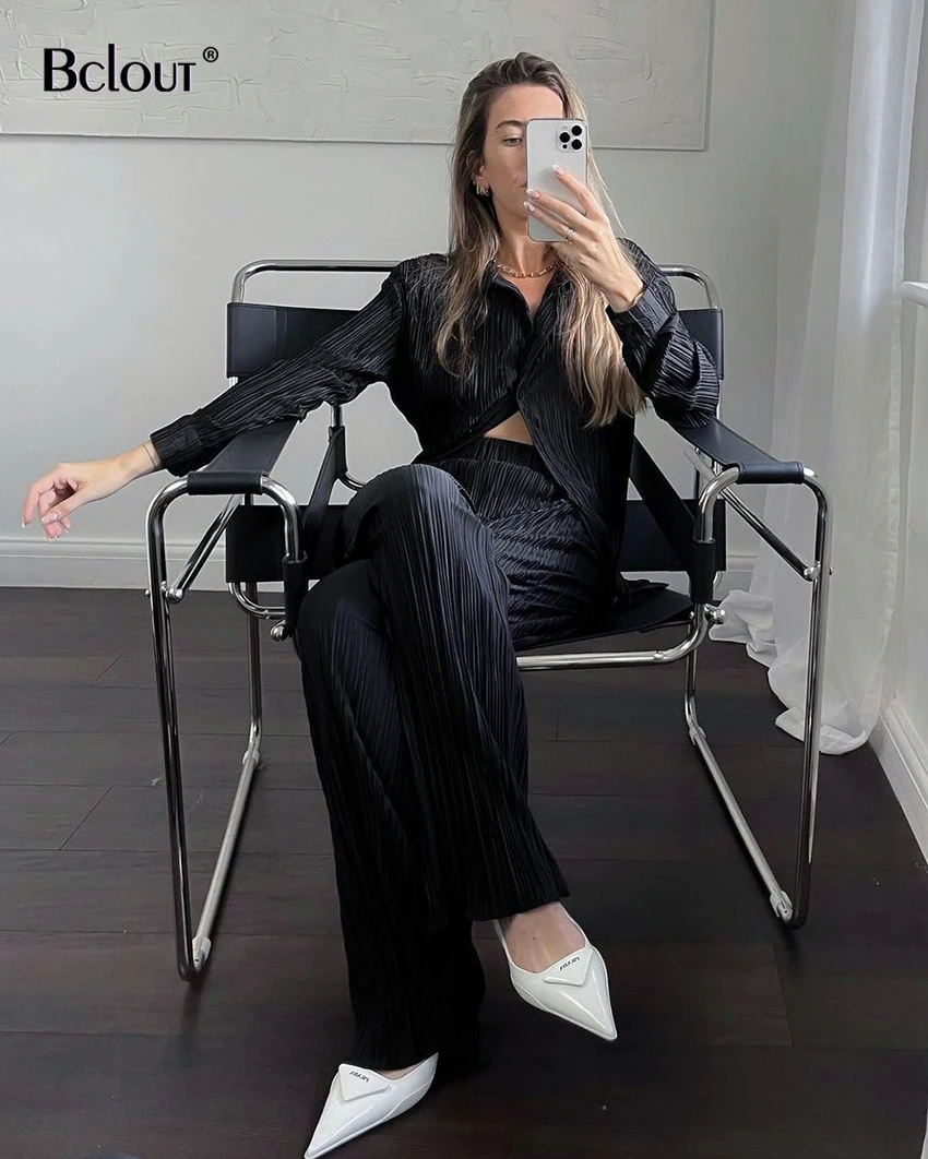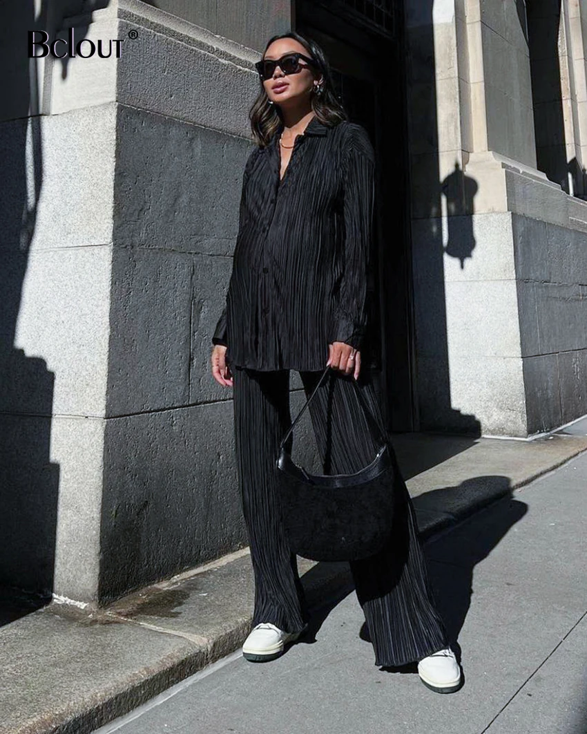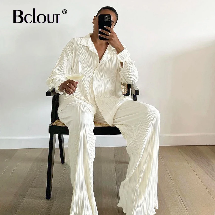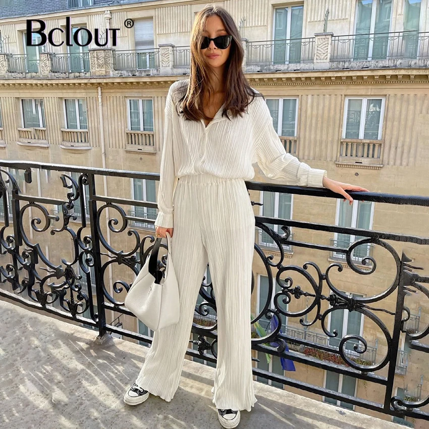 طقم بنطال أنيق بكلاوت وبيج مطوي للنساء ، ملابس من قطعتين ، بلوزات فضفاضة بأكمام طويلة ، بنطال طويل عالي الخصر ، بدلات خريفية ،