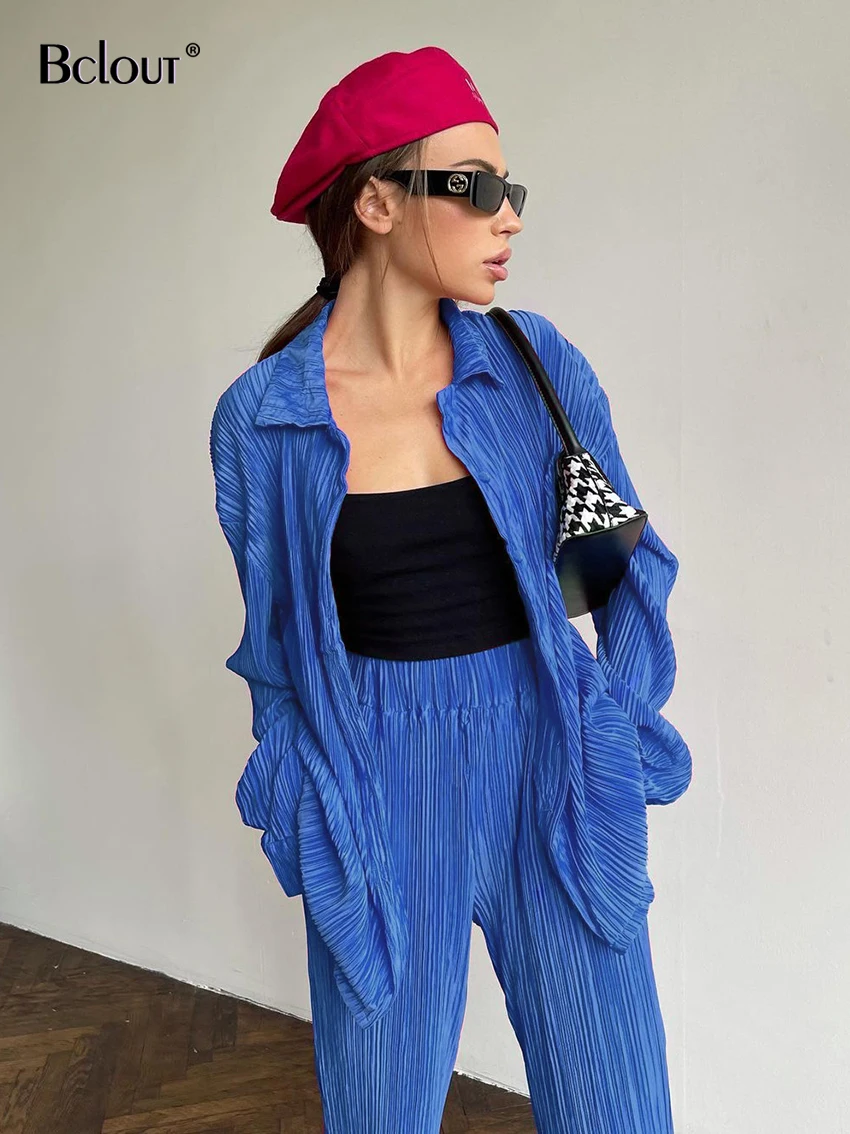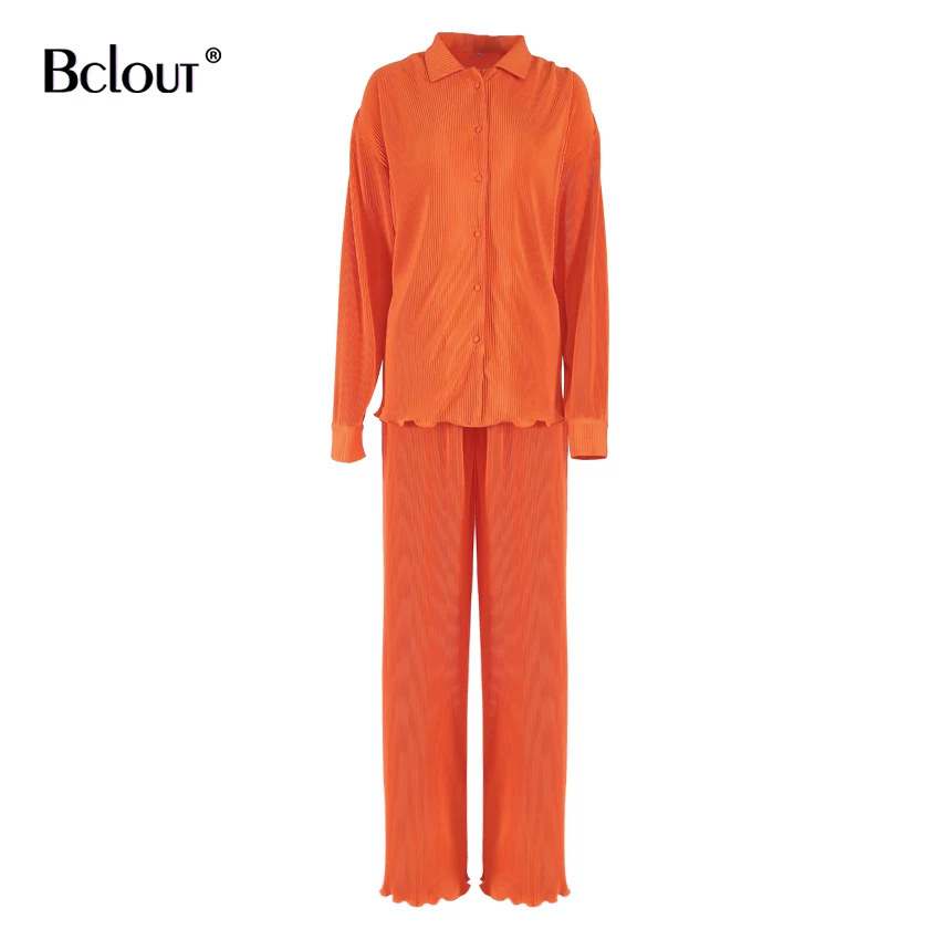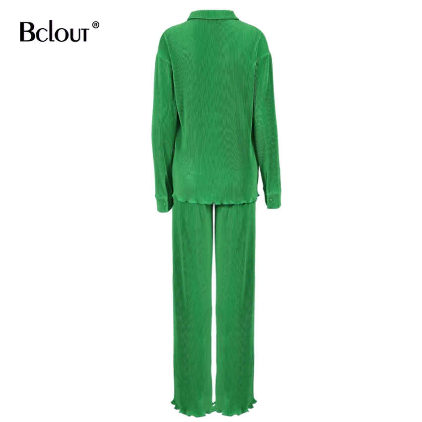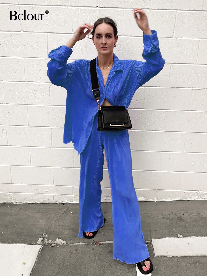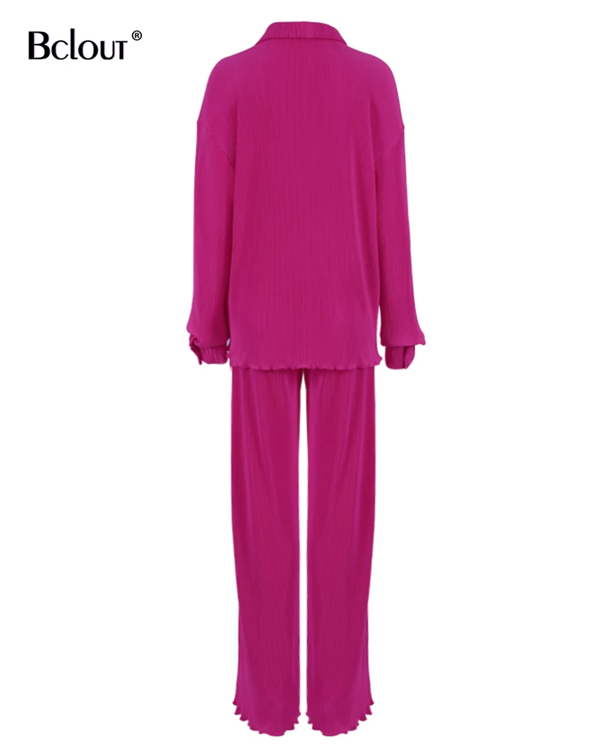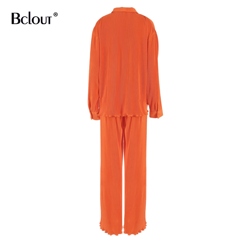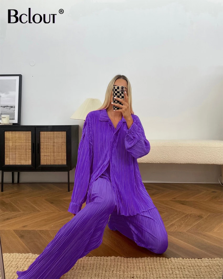 طقم بنطال أنيق بكلاوت وبيج مطوي للنساء ، ملابس من قطعتين ، بلوزات فضفاضة بأكمام طويلة ، بنطال طويل عالي الخصر ، بدلات خريفية ،