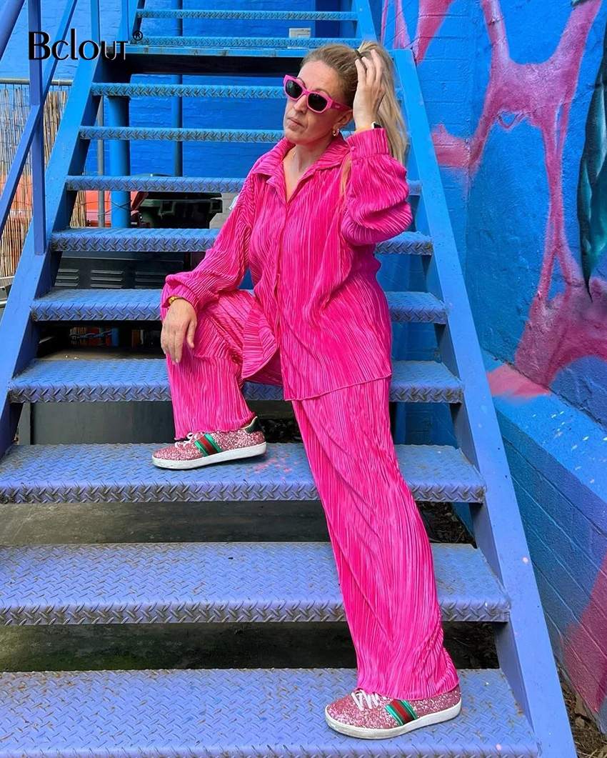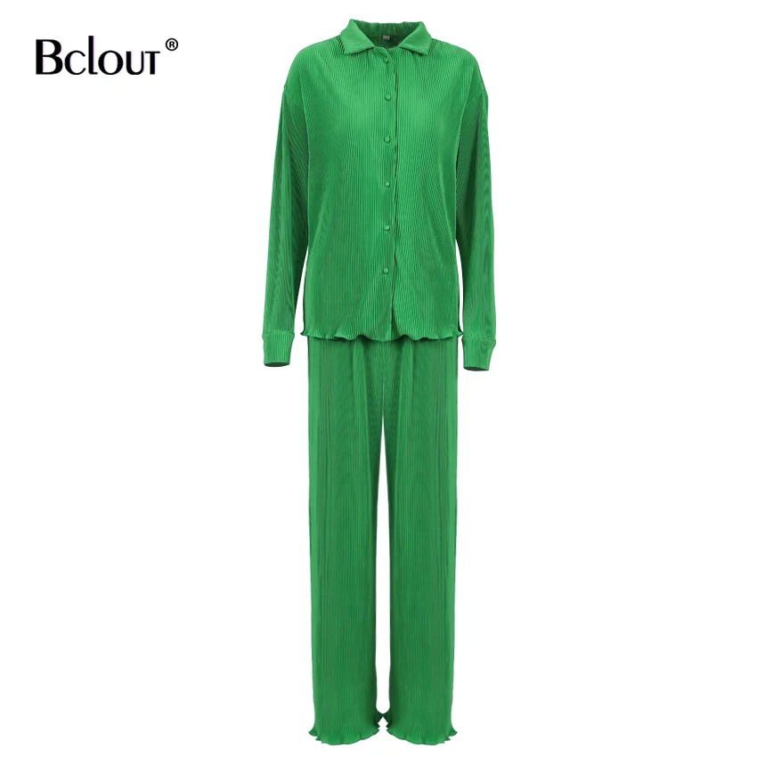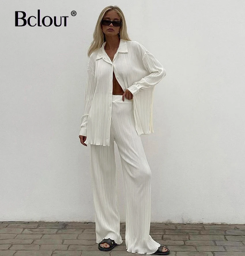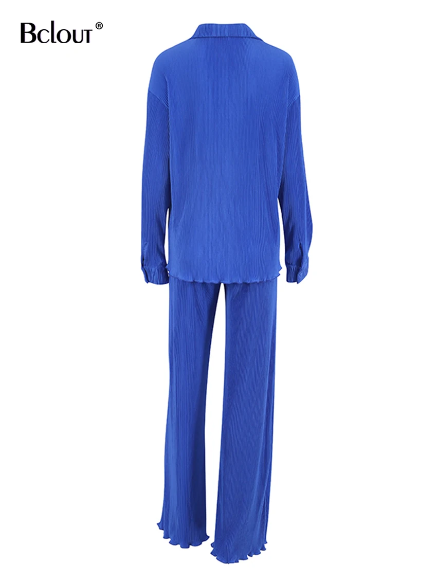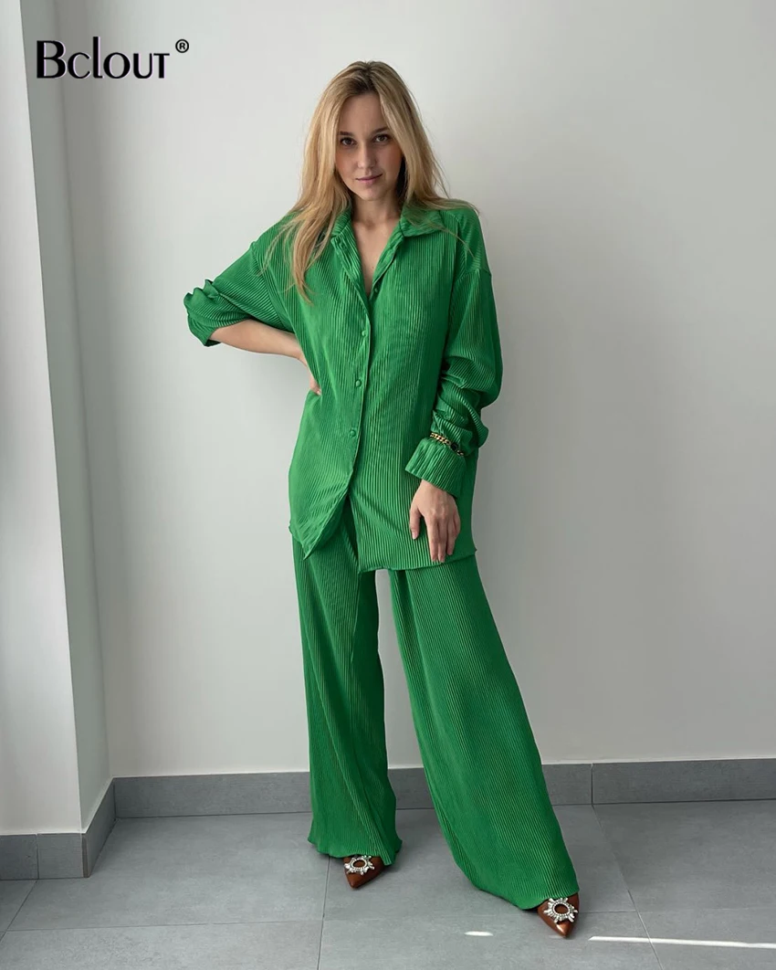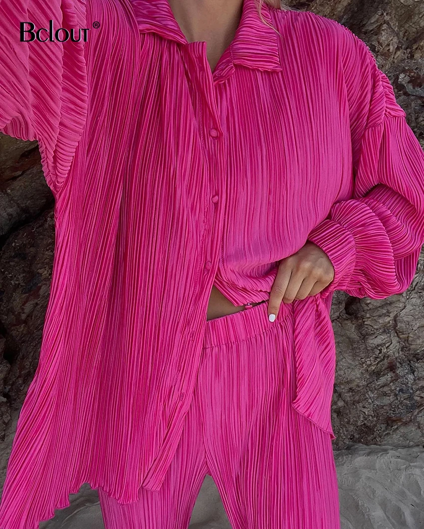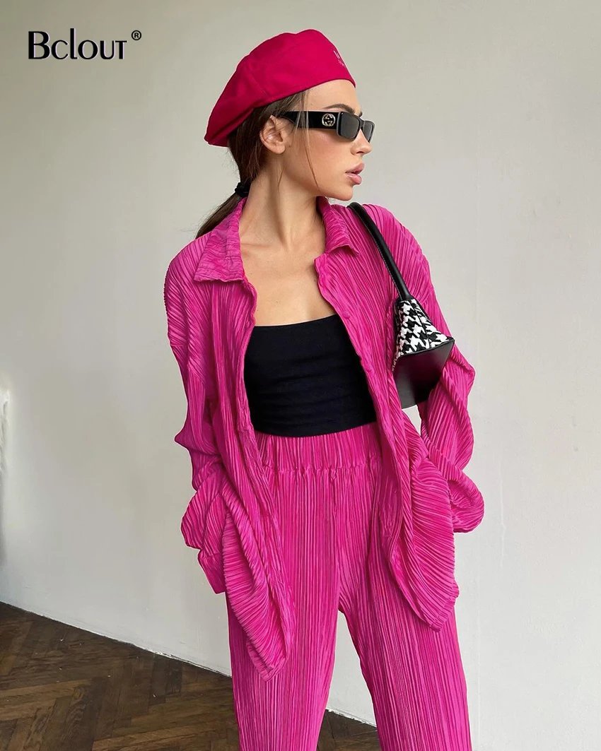 طقم بنطال أنيق بكلاوت وبيج مطوي للنساء ، ملابس من قطعتين ، بلوزات فضفاضة بأكمام طويلة ، بنطال طويل عالي الخصر ، بدلات خريفية ،