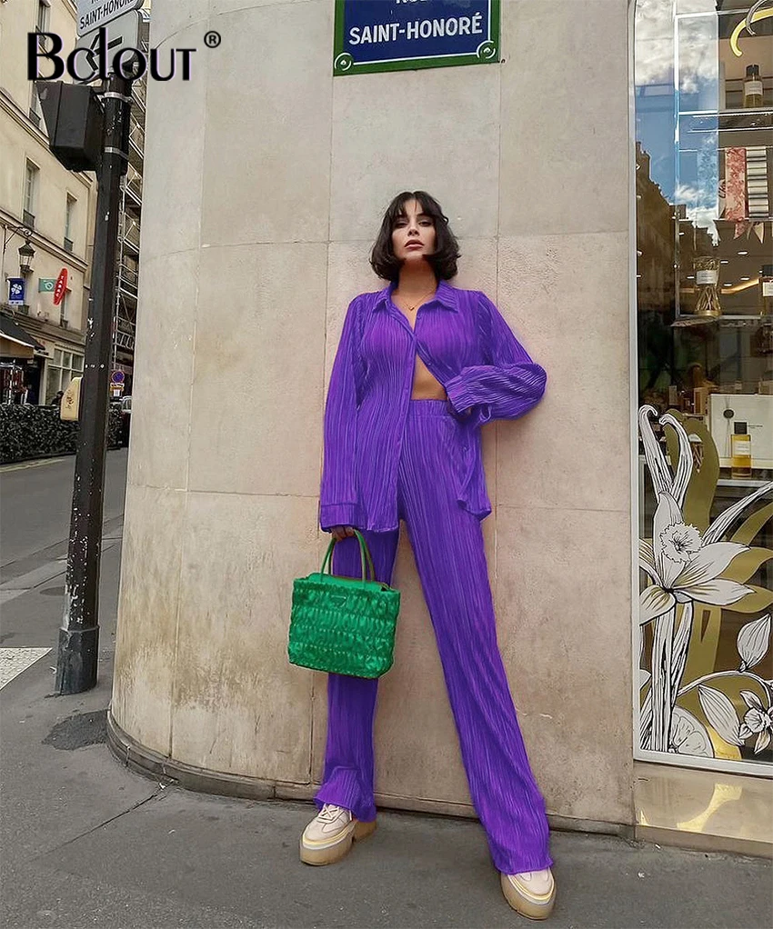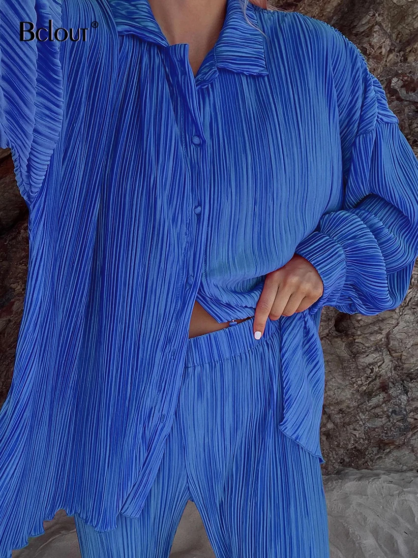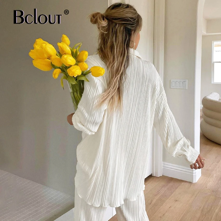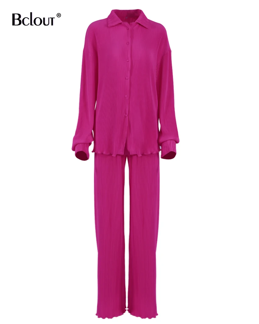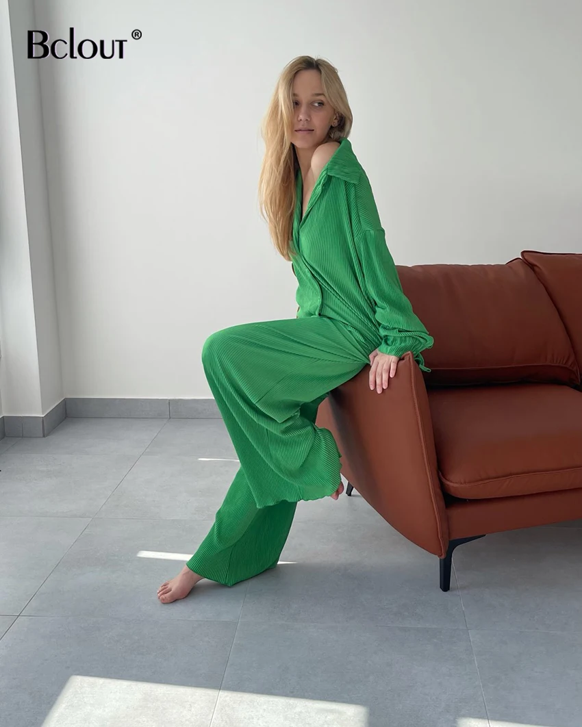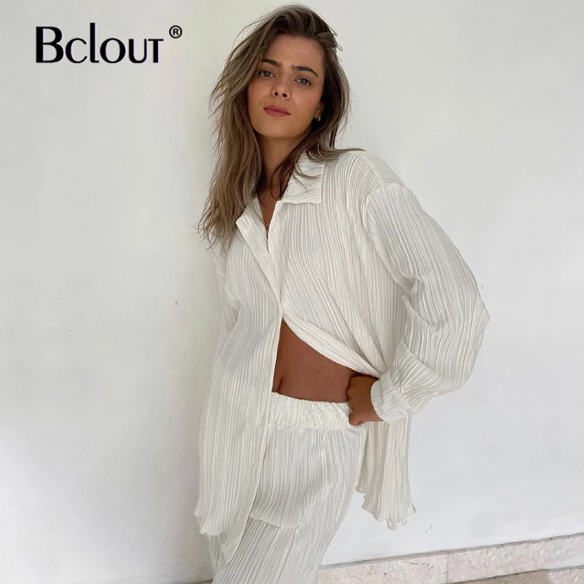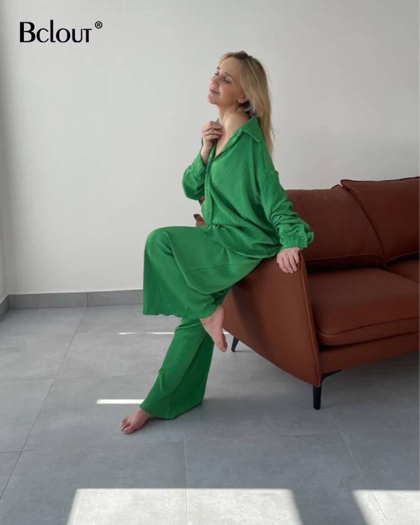 طقم بنطال أنيق بكلاوت وبيج مطوي للنساء ، ملابس من قطعتين ، بلوزات فضفاضة بأكمام طويلة ، بنطال طويل عالي الخصر ، بدلات خريفية ،