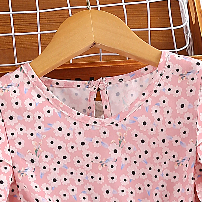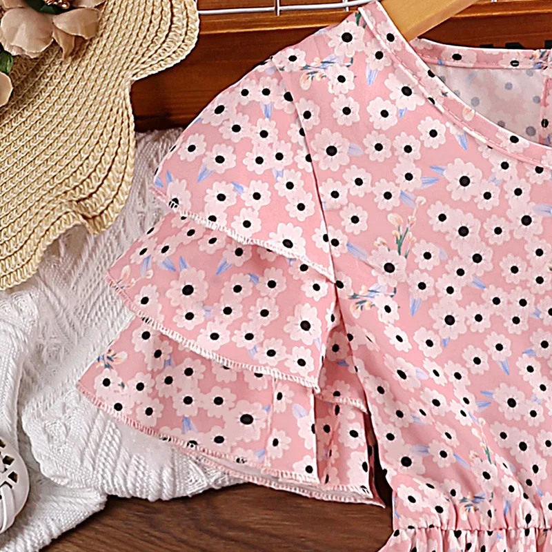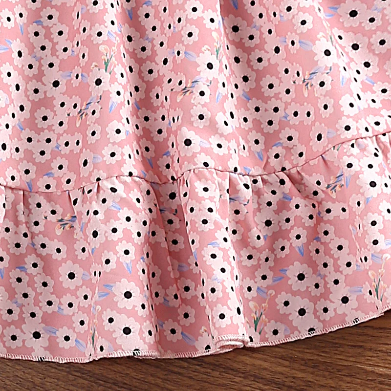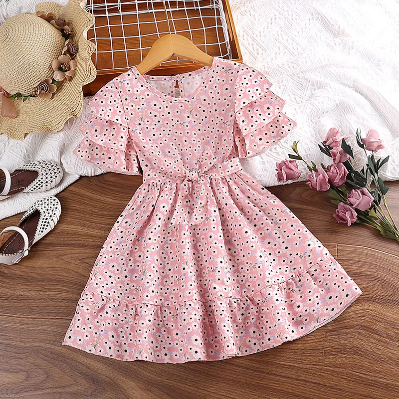 فستان بطبعة زهور مطوي على شكل حرف V ، برباط ، تنورة بطول الركبة على شكل حرف A-line ، مريحة ، لطيفة ، الموضة ، الصيف ، 4-7 سنوات ، ، ، ، ، ،