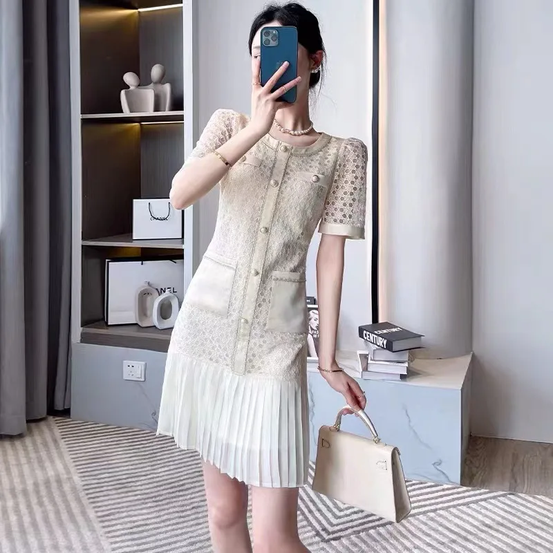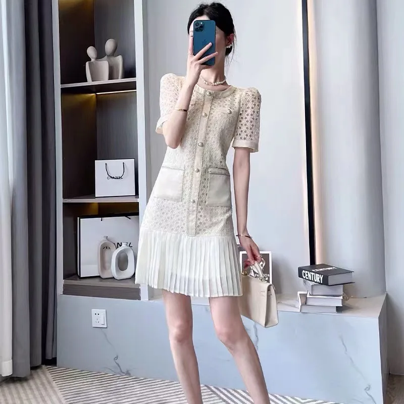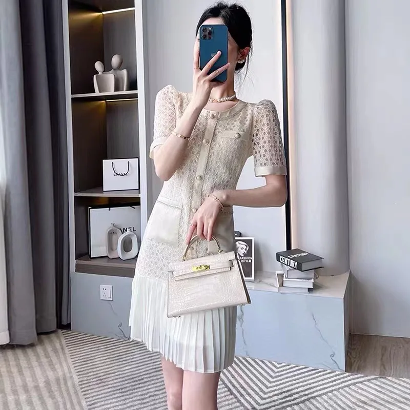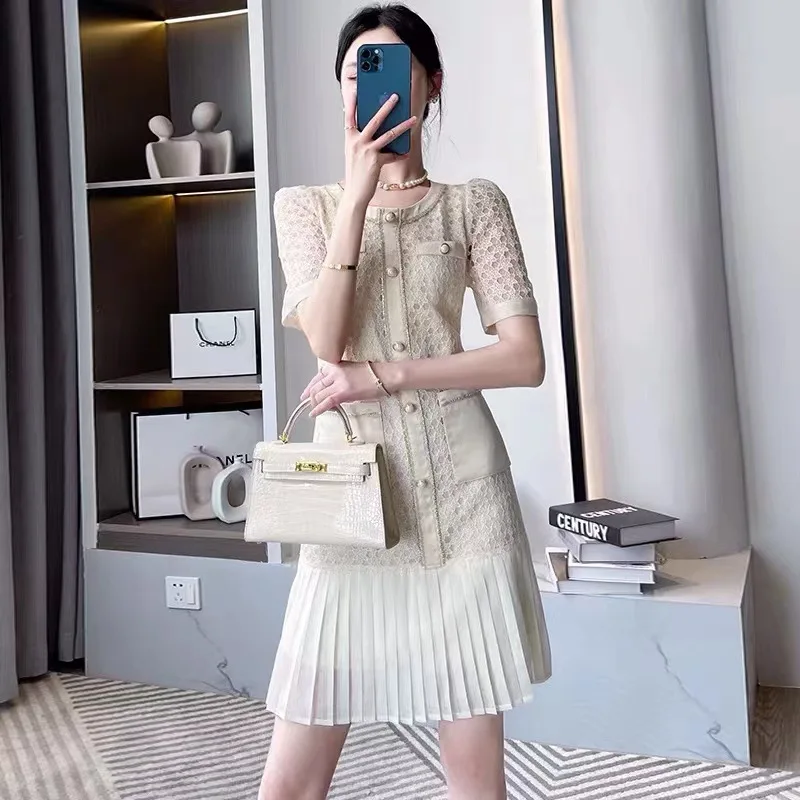 صيف جديد فاخر أنيق الفرنسية Fragrance العطر تويد المشمش المرأة الحلو أكمام فستان مثير طويل Vestidos