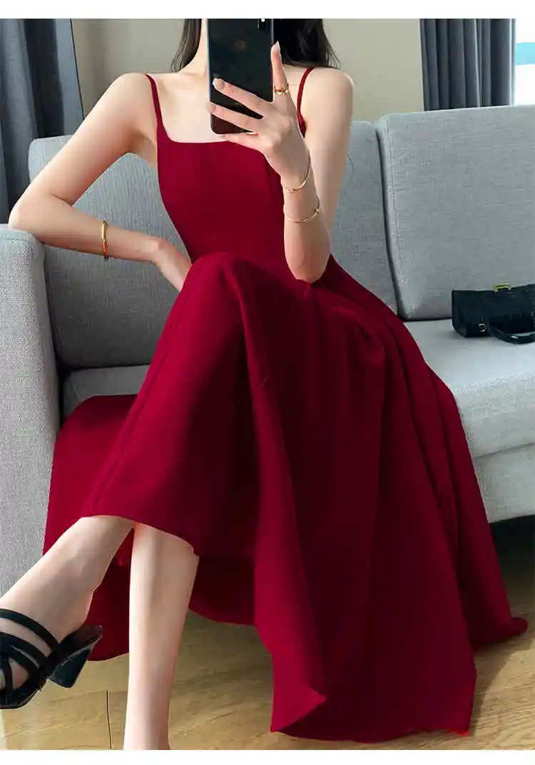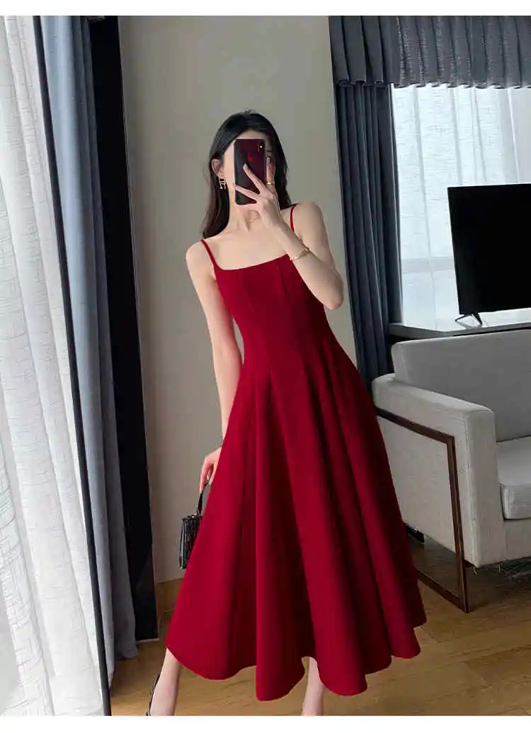 فستان نسائي متوسط الطول برقبة مائلة عارية الظهر ، بدون أكمام ، خصر مرتفع ، قميص قصير أحمر ، حمالة ، أنيقة ، فاخرة ، عتيقة ، صيفية ،