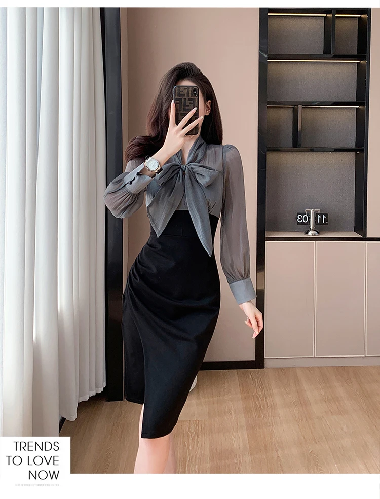 فستان مكتب بياقة مقوسة مرقع ، فستان أنيق ضيق ، فستان رسمي ، فستان سهرة كلاسيكي ، أسود وأبيض ، كوري ، خريف وشتاء ،