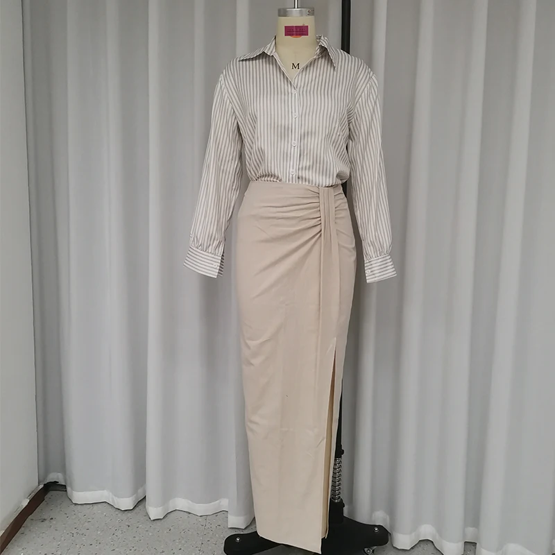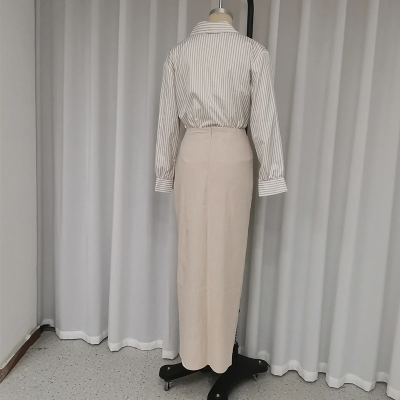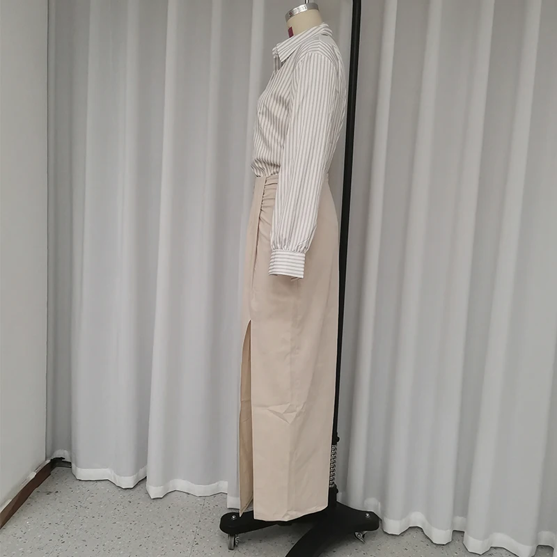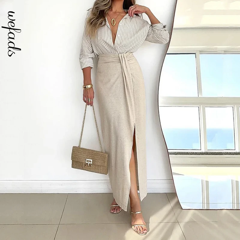Wefads-قميص نسائي بأكمام طويلة مخطط بطية صدر واحدة ، فتحة بخط واحد ، مجموعات تنورة غير منتظمة بثنيات ، 2