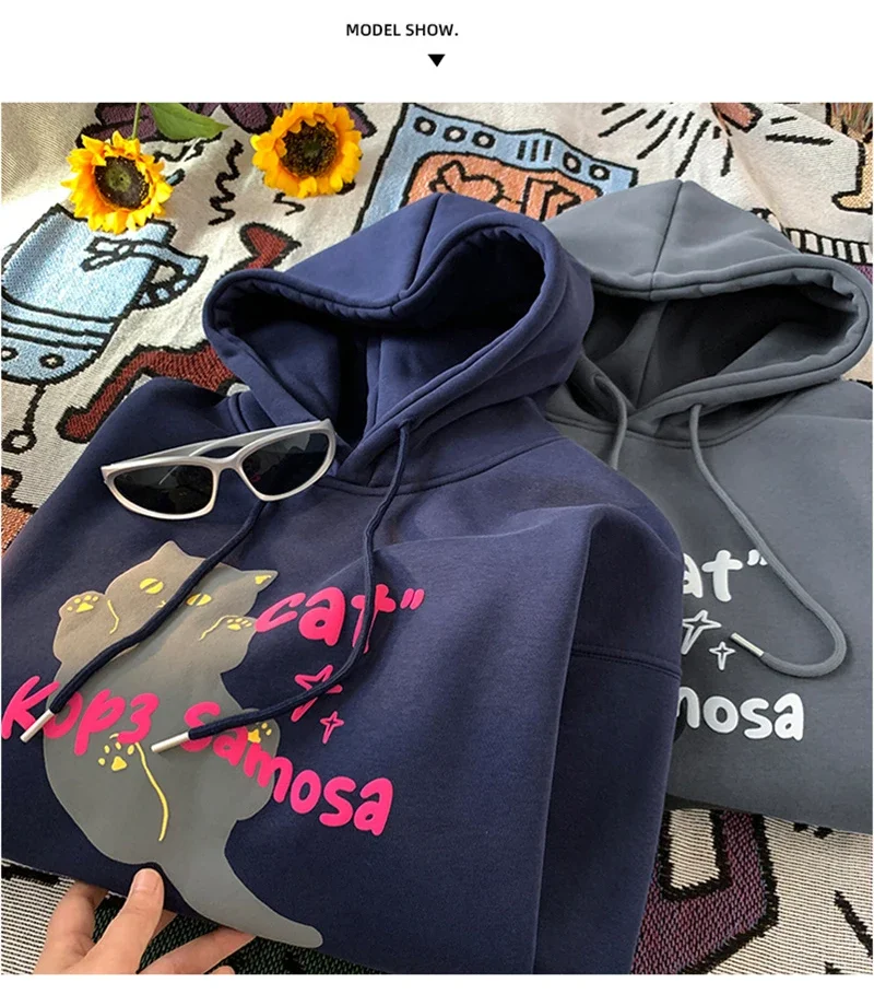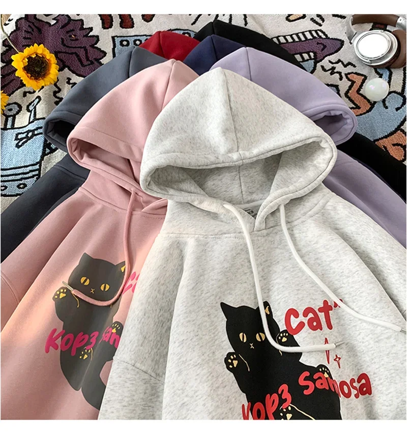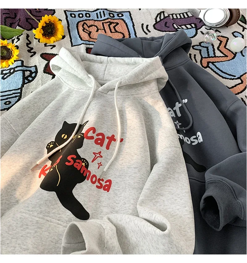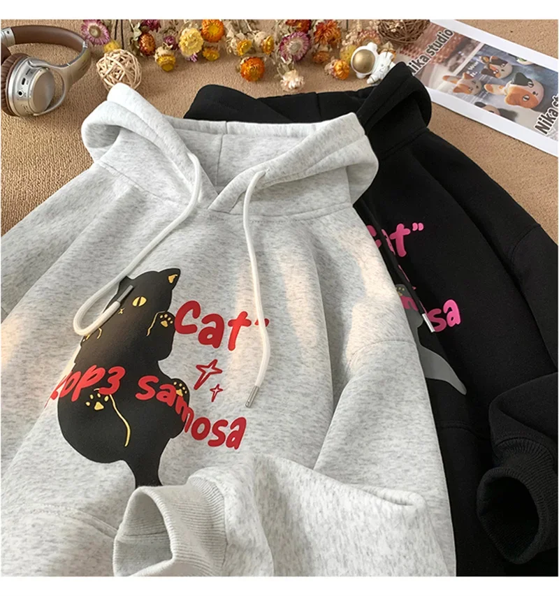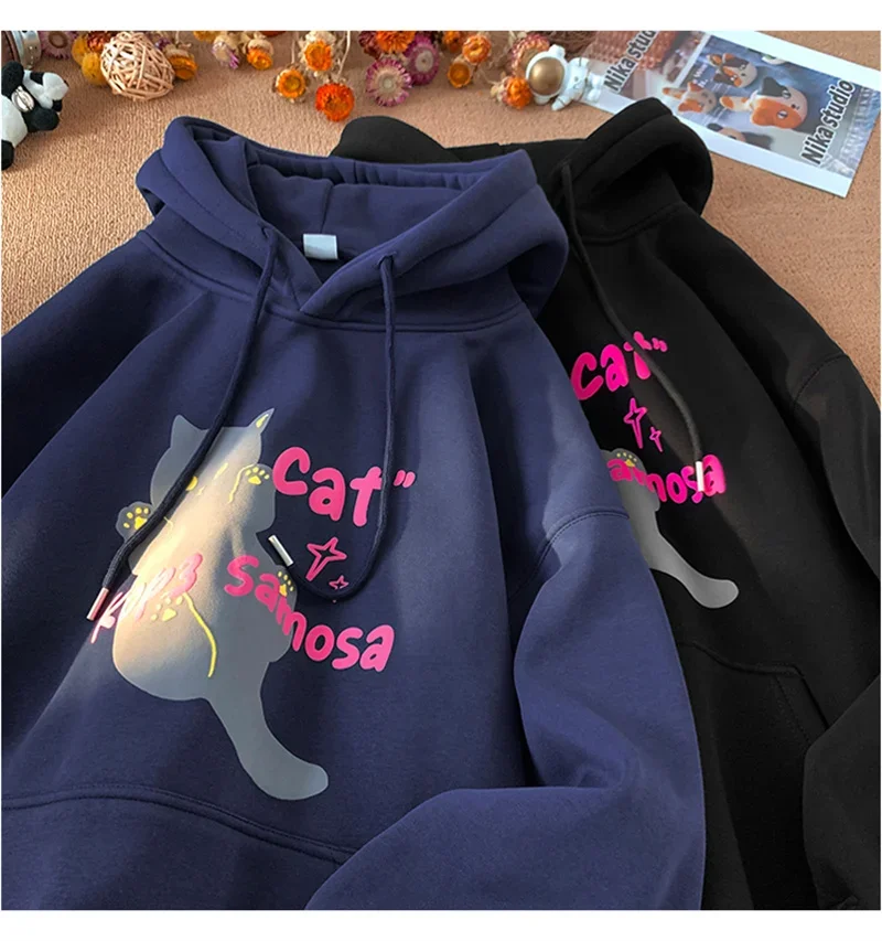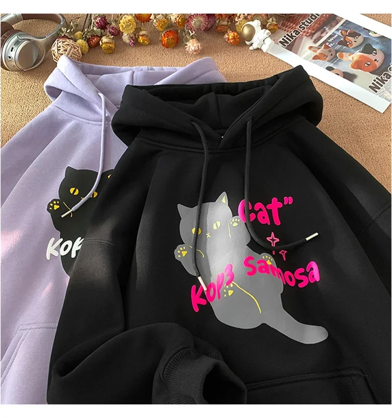 جديد أنيمي Kawaii القط المطبوعة البلوز قمصان سويت شيرت بقلنسوة الرجال الرجعية جيب كم طويل هوديس الخريف النساء Y2K الشارع الشهير هودي